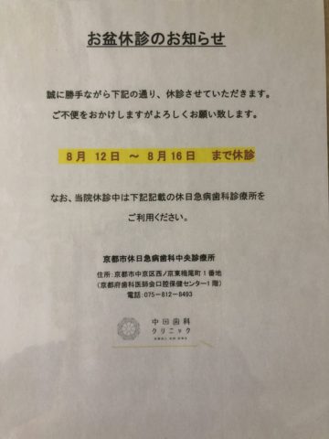 こんにちは。衛生士の秋山です。中田歯科は8日、9日 休診10日、11日 診療12日〜16日 休診させていただきます。休日診療所のご案内京都市休日急病歯科中央診療所075-812-8493